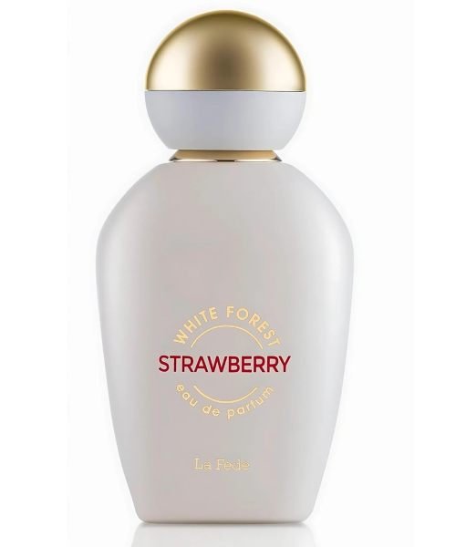 La Fede White Forest Strawberry By Khadlaj, launched in 2025. A fruity floral gourmand fragrance featuring top notes of strawberry and blackberry, heart notes of jasmine and rose, and base notes of vanilla, amber, and sandalwood. The composition opens with a sweet-tart berry accord, transitions to an elegant floral bouquet, and settles into a warm, creamy drydown.