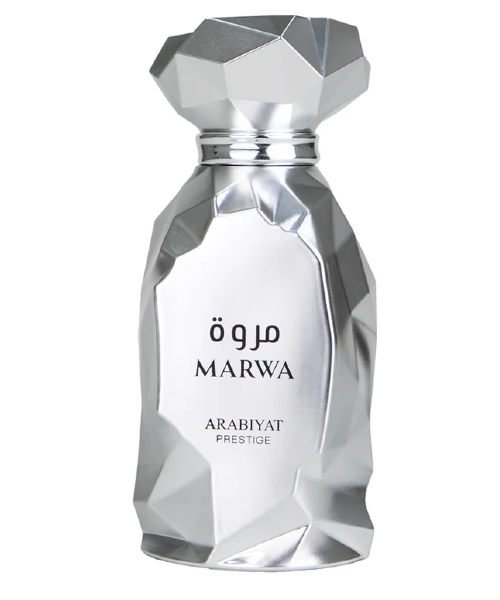 Marwa By Arabiyat Prestige, launched in 2025. The perfume opens on a fresh burst of zesty bergamot and ginger. The heart carries the black tea from China – a unique ingredient that heightens wanderlust – while sitting on a bed of seductively smoky incense and the rosy and green facets of geranium. The dry drown is an opus of intense sensuality as amber-like accord of ambroxan jostles with the depth of guaiacwood while resting on musk.