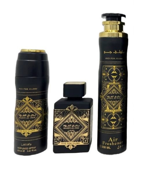 Oud For Glory 3pc Gift Set By Lattafa, luxurious unisex fragrance collection that blends richness, intensity, and timeless elegance. Known for its opulent oud base and captivating sweet-woody accords, Badee Al Oud is perfect for those who appreciate long-lasting, high-quality Arabian perfumery.