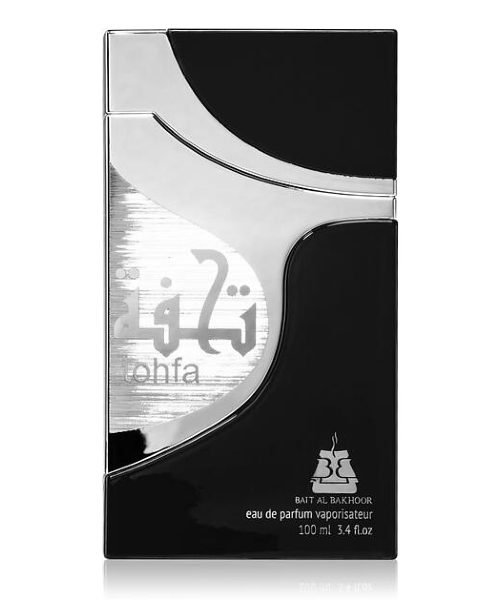 Tohfa Black By Bait Al Bakhoor, launched in 2021. Top notes are Agarwood (Oud), Saffron and Rose; middle notes are Spicy Notes, Labdanum and Ambergris; base notes are Agarwood (Oud), Balsamic Notes and Moss.