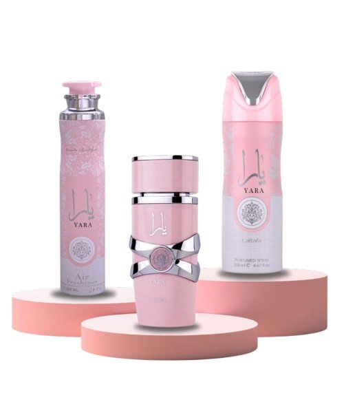 Yara Gift Set By Lattafa, launched in 2020. Top notes are Orchid, Heliotrope and Tangerine; middle notes are Gourmand Accord and Tropical Fruits; base notes are Vanilla, Musk and Sandalwood.